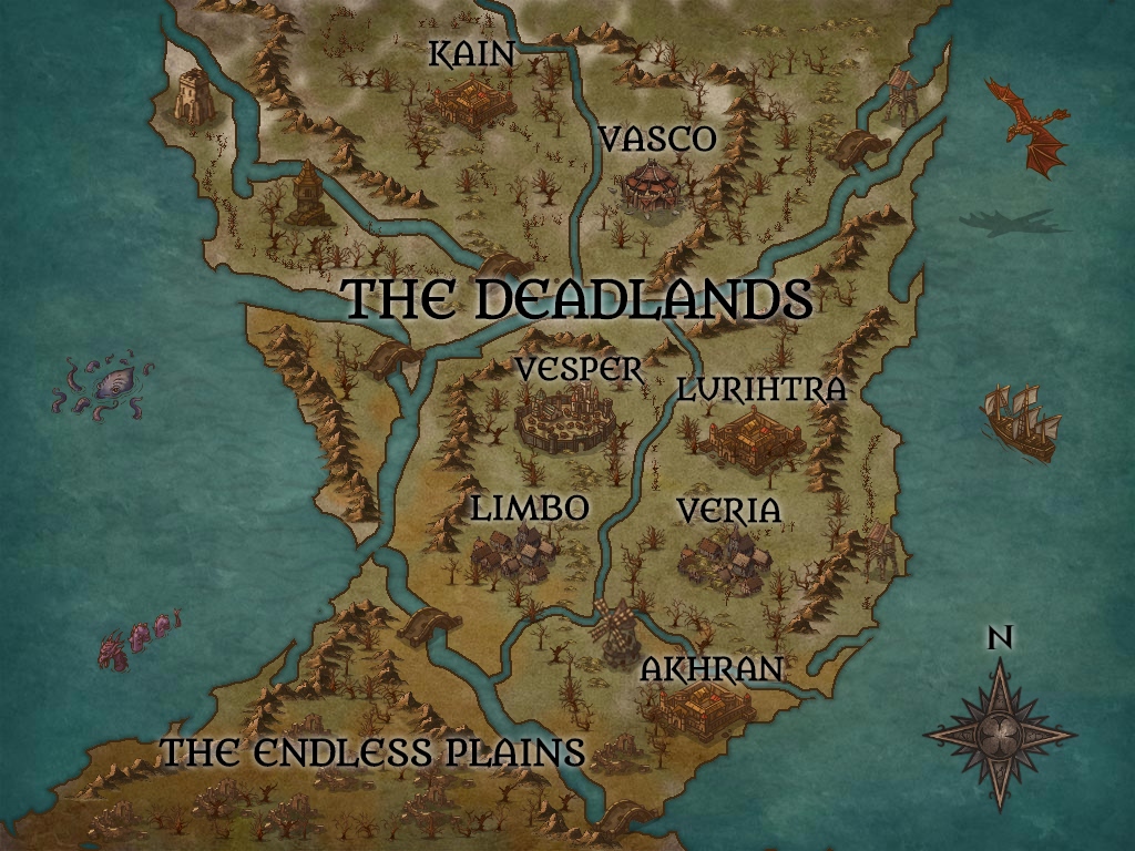 The Deadlands is the middle continent of Nera, which sits between the Winterlands and the Summerlands. While the Winterlands possess regions named after major gods of light and darkness, the Deadlands is dominated by the major gods of darkness such as Vasco, the god of time, Veria, the goddess of hell, and Akhran, the god of magic and sorcery, while also feautring the major goddess of light, Lurithra’s, city.