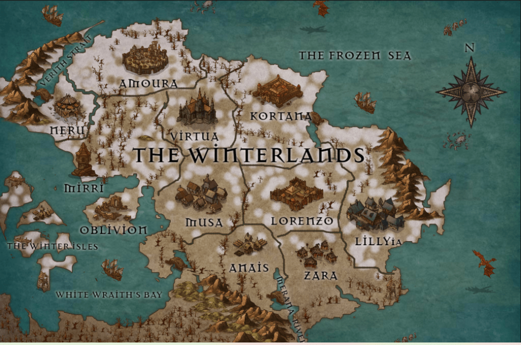 The Winterlands is the Northernmost continent of the magical realm of Nera, and like every other continent in Nera, is broken into cities that are named after major and minor gods.